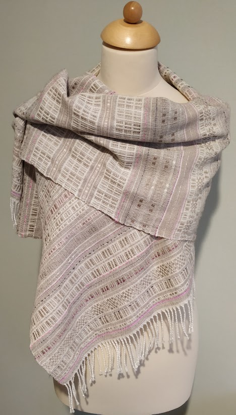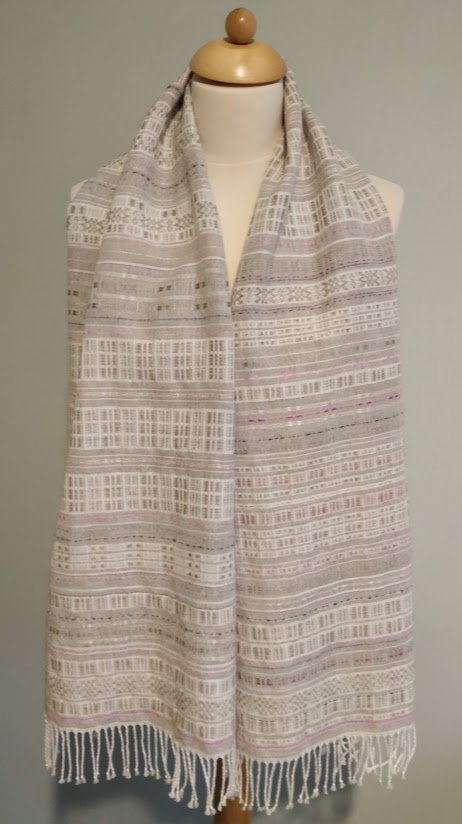 Szürke-fehér-rózsaszín, különböző összetételű fonalakkal szőtt, végig mintázott kendő.