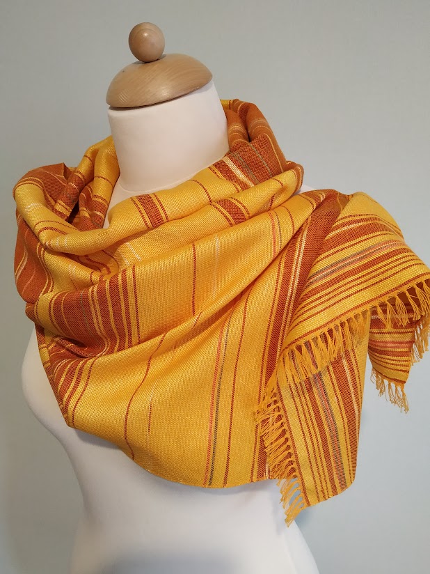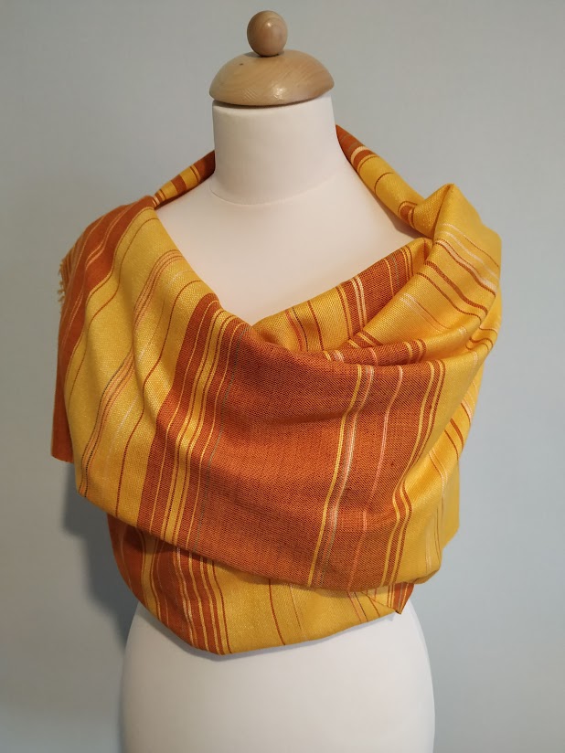 Mézsárga és rozsdabarna színű, csíkos kendő.
